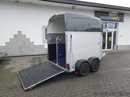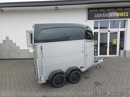 Hästvagn Champion Esprit C SK – för 2 hästar, 2400 kg, BPW-chassi sänkt, godkänd för 100 km/h med stötdämpare, aluminiumväggar silveranodiserade / polyestertak grönt, låsbar sadelkammare, presenningslyft, transparent mellanvägg utan PVC-topp, limmad och tätad gummigolvyta, gummi på ramp med halklister längs kanterna, 13-polig kontakt med backljus, automatisk stödhjul, ny modell 2025, svarta navkapslar...