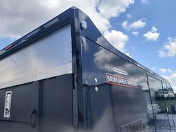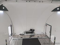Modell 2024: Biltransport Race Transporter 6, 650x235x189 cm, 3500 kg tridem lågbygge med AL-KO Bradley lågbyggeschassi, 13" aluminiumfälgar silver, slutet polykarosseri, dubbla sidodörrar, sidoplacerade serviceluckor, perforerade körskenor och körbar baklucka, elhydrauliskt tippbart lastplan, elektrisk vinsch, förvaringslådor med aluminiumlock i golvet, LED-belysningspaket interiör, 4 röda surrningsband, kopplingslås, reservhjul, stödhjul, med mera.